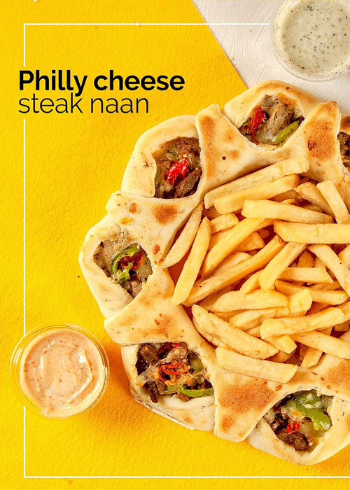 Grilled Beef Tenderloin Seasoned with Black Peppercorn, Capsicum, Onion, Red Chili and Mozzarella Stuffed Twister Naan Served with Black Peppercorn Dipper & French Fries