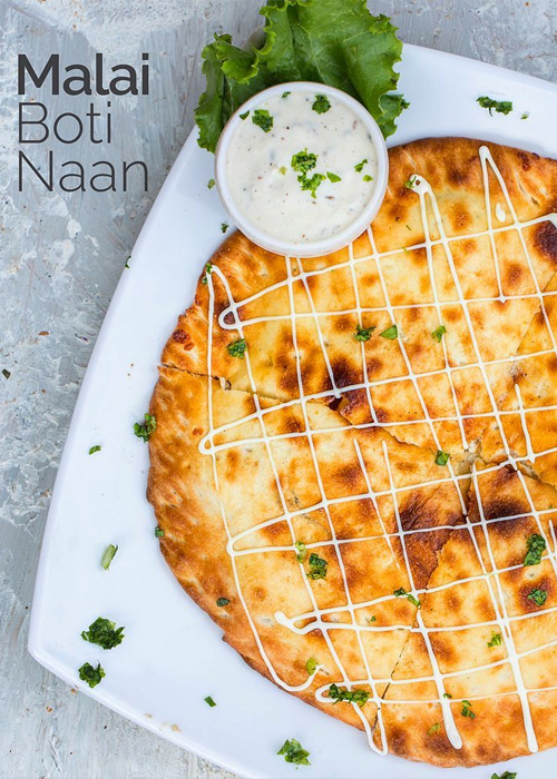 Seasoned Mutton,Mozzarella, Onions and Garlic Stuffed Naan Served with Raita Dipper